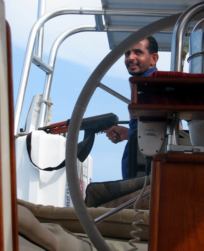 Haitham has his hands in a number of ventures, and one of them turned out to be – wouldn’t you know! – providing armed security for vessels transiting the Gulf. We had tinkered with the idea of hiring such personnel to accompany us through pirate alley, but at $20,000 for a week-long passage, it didn’t seem like a rational economic decision.