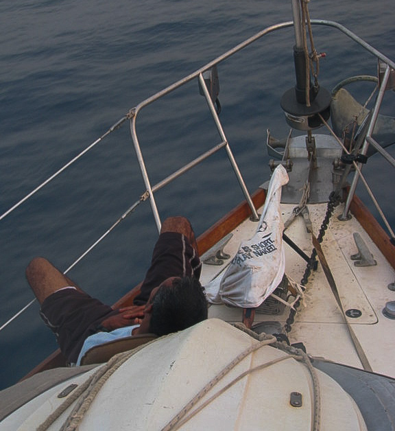 It was now dark, and the Gulf of Aden met us with heavy rollers. After having worked below for two hours, none of us felt great. But we ate some food, drank some water, and quickly recovered. We went back down below, made dinner for all, and we set up watches for that first night.