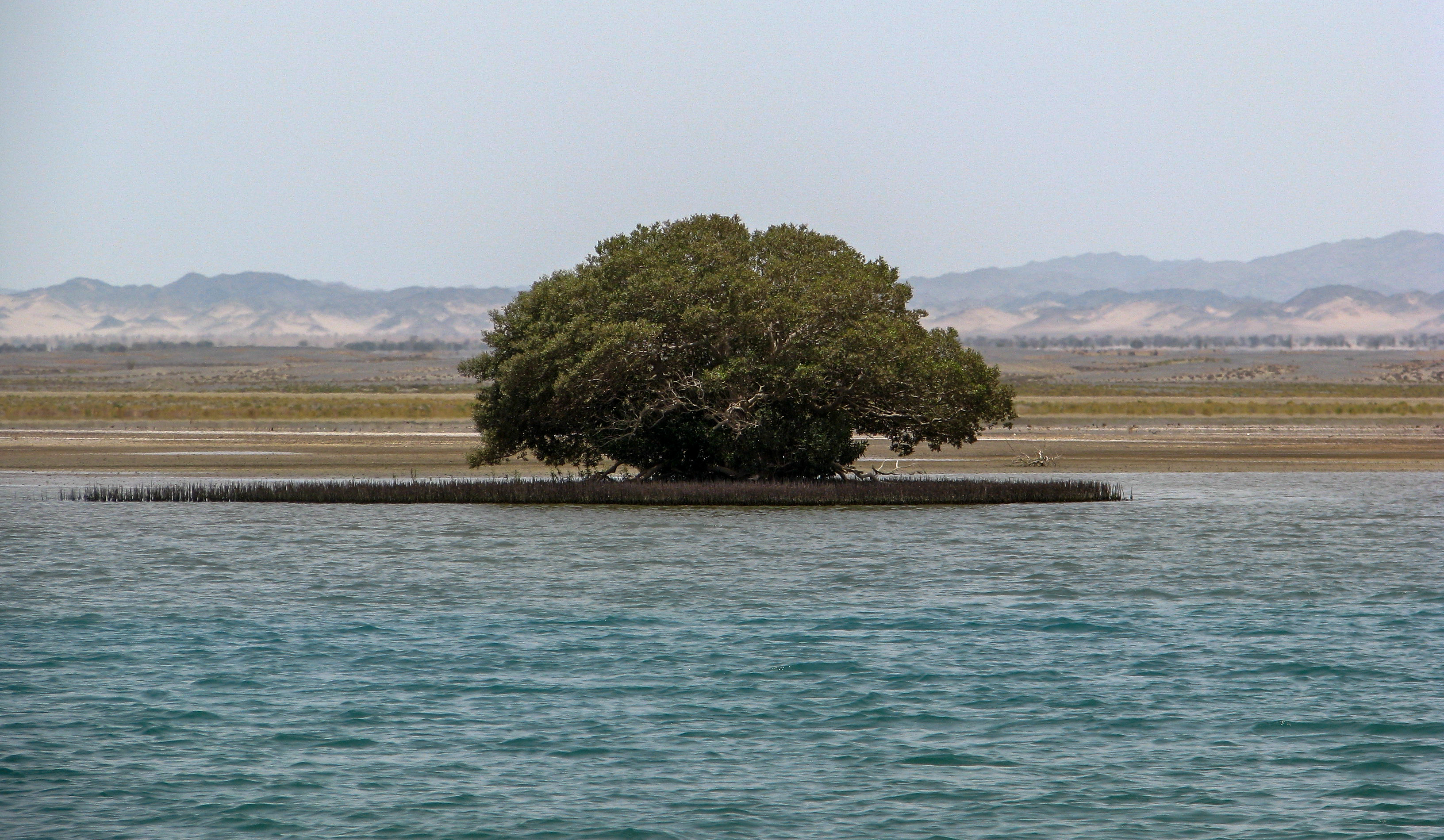Although our view stretches for many miles, we can count on one hand the number of green things we see. There is one very big tree very nearby, however. It sits on a little island that pushes its way out into this bay, more reeds and mud than actual earth. That tree must have figured out a way to live on salt water because there is no way that it can be getting pure fresh water where it grows. But whatever it does drink, it’s done a good job, because in a bleak area otherwise devoid of plant life, it has spread an umbrella of green against a washed-out landscape.