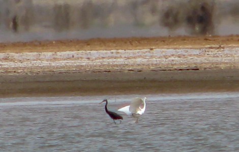 Two more birds fly by. Are they the herons we just saw ashore? The first one is jet black, with a long pointy beak, it’s legs trailing behind, and its neck folded up tight in flying formation. We turn the binoculars to a bird just behind it. It’s the exact same bid, except this one is all white. Is the one in front a juvenile? The one in back has its mouth agape, and is screeching at the one in front, apparently driving him away. The black bird does go away, and his white twin returns to wading at the spit.