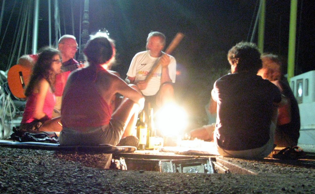 Sharla took out some instruments from her boat.  Bongo drums, a harmonica, a flute, a kazoo, a xylophone.  We all banged and tweeted.  But those were put aside when a guitar appeared, and someone who could actually play it.  The guitarist sang in Italian.  And then Gipo took a turn.  Corrine translated for us, though Sima, with her handle on Italian, mostly didn’t need it.