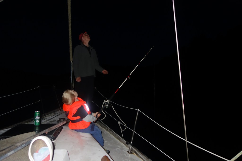 Alexander and I then went for a row around the tiny bay that night. We drifted close to the power boat along the dock, and met Kirsten and Apen. Countless small herring were jumping out of the water all about us. “The mackerel are chasing them to the surface,” Apen observed. “Are you going to fish for them?” he asked. I showed him that we were trailing a line off the back of the dinghy, as I began to teach Alexander about fishing. I then told him a story about fishing trips with my own father as a kid. It is a story that I have told before.